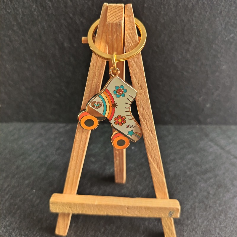 24K gold metal hard enamel roller skate with rainbow keychain with small jump ring and 30mm flat ring