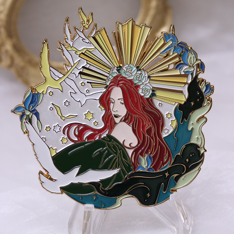 Soft enamel,long hair beauty,cutouts.rose ,pigeon,good for collection.
