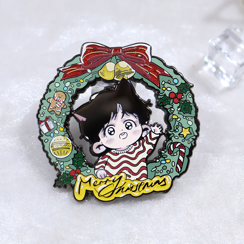 The pin is framed by a Christmas wreath, decorated with classic Christmas elements such as bells, gingerbread men, gift boxes, candy canes, holly berries, and a shiny red bow, adding a festive touch.