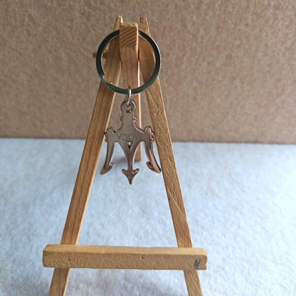 polished silver metal trident keychain with one jump ring and one 30mm flat ring, with printing