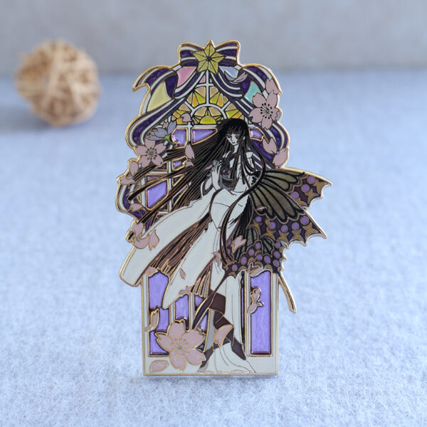 This enamel pin depicts a character from an anime. The main figure is depicted in a flowing white dress, framing her elegant figure, with her signature long hair flowing down, creating a mysterious and alluring look, perfectly capturing the character’s aura.