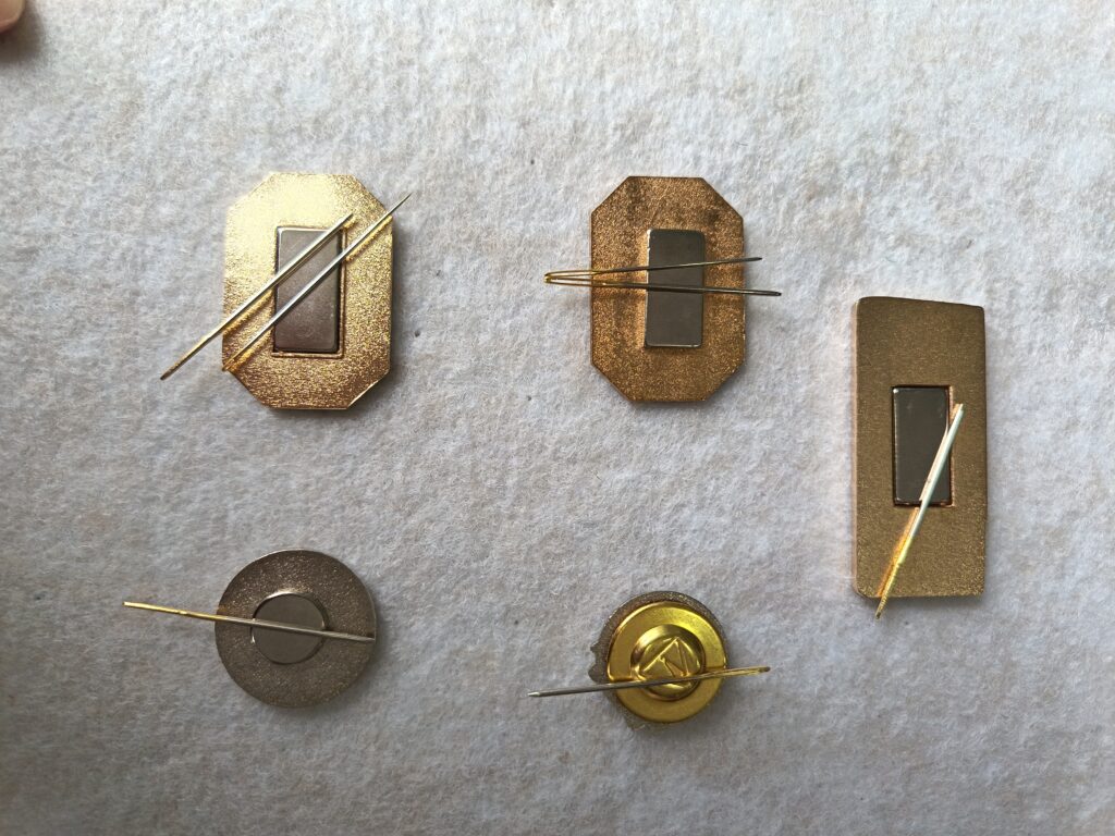if the needle minder pins’ shapes are regular, and the size is not big, we can use iron to make these pins, then put the magnet or magnet disc on the pins’ backside directly. pins and magnets can attract each other.